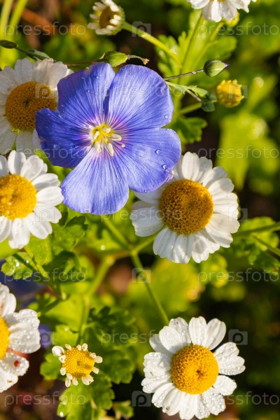 Нежный ярко-синий цветок, декоративный цветок льна и белые ромашки. крупным планом