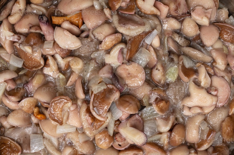 Жареные с луком грибы, нескольких сортов, вид сверху, крупный план