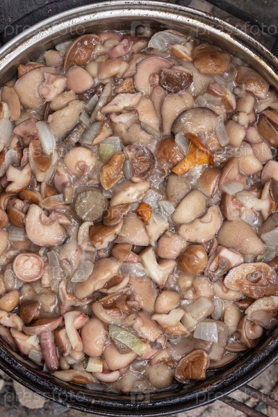 Жареные свежие грибы в металлической сковороде. пикник на природе. крупным планом