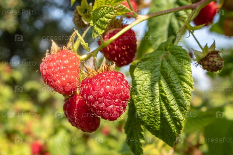 Крупный план нескольких спелых ягод малины, висящих на ветке в саду. Тульская область, Россия