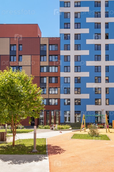 Современный многоквартирный дом с красочными фасадами на окраине города. Жилой комплекс «В лесу», Москва, Россия