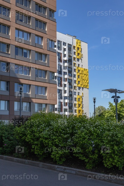 Современный многоквартирный дом с красочными фасадами на окраине города. Жилой комплекс «В лесу», Москва, Россия