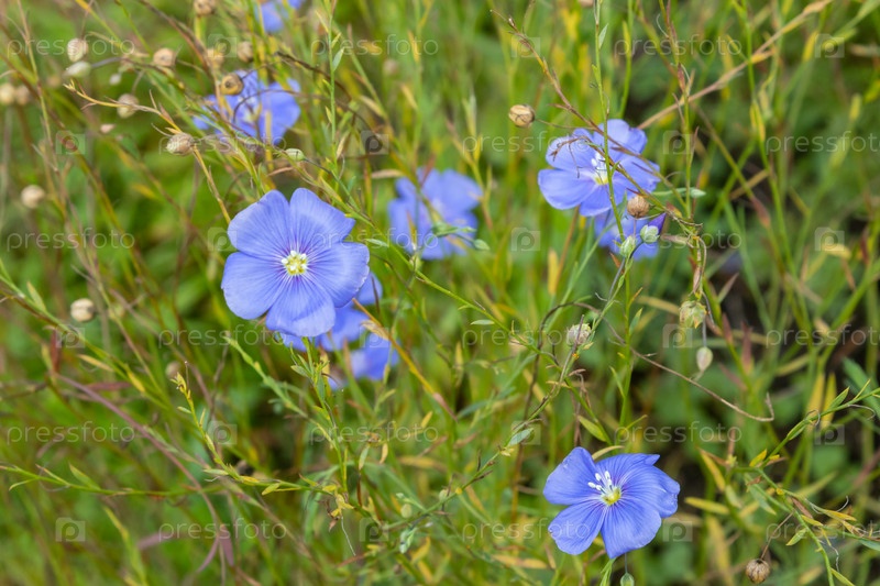 Голубые цветы льна на клумбе, лето, крупный план