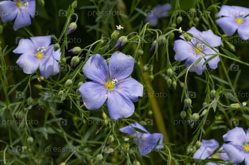 Голубые цветы льна на клумбе, лето, крупный план