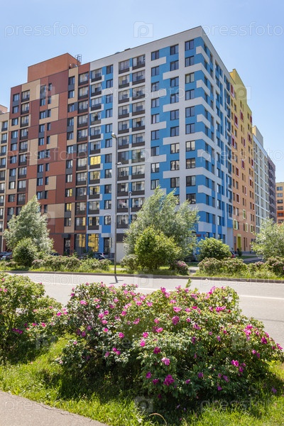 Современный многоквартирный дом с красочными фасадами на окраине города. Жилой комплекс «В лесу», Москва, Россия