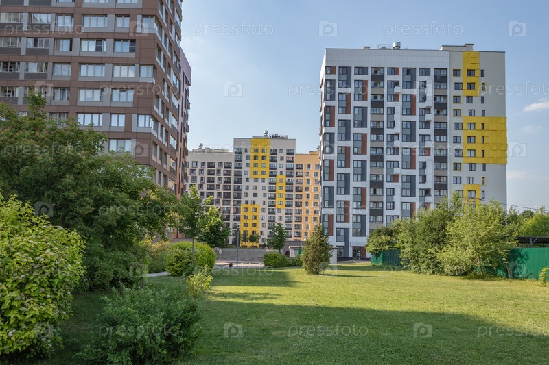 Современный многоквартирный дом с красочными фасадами на окраине города. Жилой комплекс «В лесу», Москва, Россия