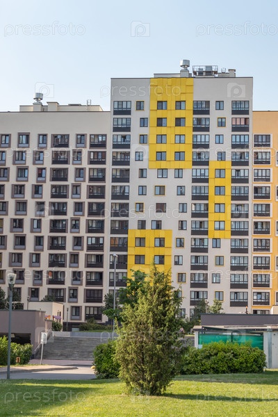 Современный многоквартирный дом с красочными фасадами на окраине города. Жилой комплекс «В лесу», Москва, Россия