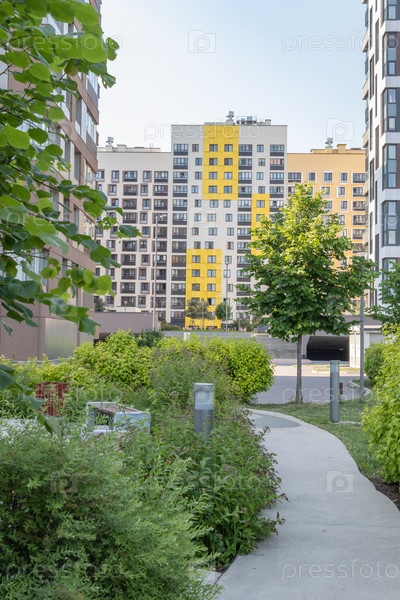 Современный многоквартирный дом с красочными фасадами на окраине города. Жилой комплекс «В лесу», Москва, Россия