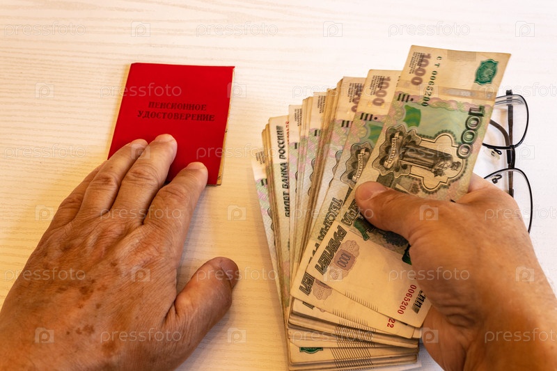 Пенсионное удостоверение, банкноты 1000 рублей, руки пенсионера. Надпись на удостоверении: «пенсионное удостоверение»