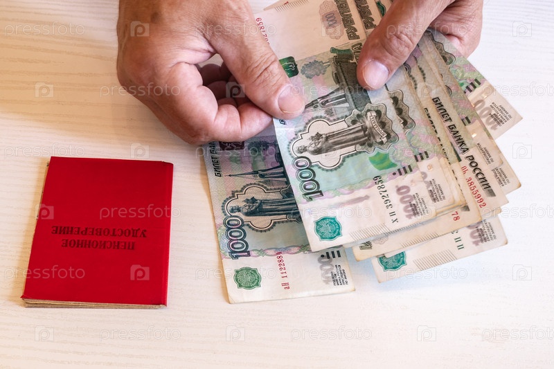 Пенсионное удостоверение, банкноты 1000 рублей, руки пенсионера. Надпись на удостоверении: «пенсионное удостоверение»