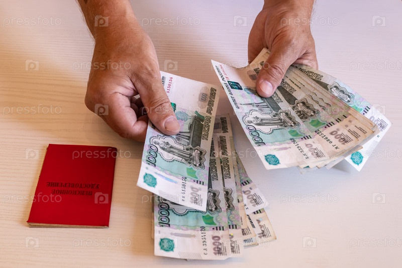 Руки пенсионера рассматривает купюры в 1000 рублей, пенсионное удостоверение. Надпись на удостоверении: «пенсионное удостоверение»