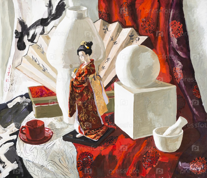 Натюрморт с японской куклой, геометрическими фигурами