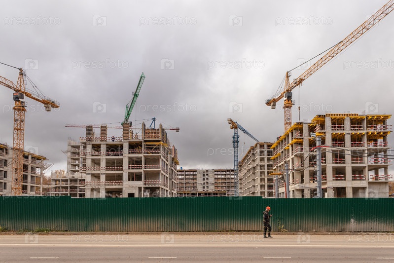 Строительство третьей очереди нового жилого комплекса «В лесу». Работа строительных кранов, идет возведение стен зданий. Москва, Россия