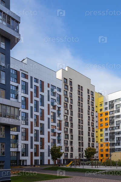 Современный многоквартирный дом с красочными фасадами на окраине города. Жилой комплекс «В лесу», Москва, Россия