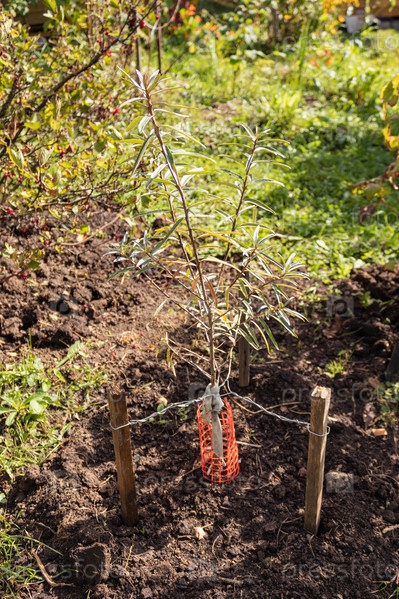 Небольшой саженец облепихи посаженный в саду. Дерево высаживают в почвенный субстрат. Рассада с боковыми надставками и сеткой от грызунов