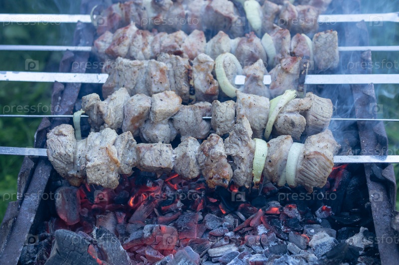 Здоровое мясо барбекю на шампурах над мангалом на открытом воздухе