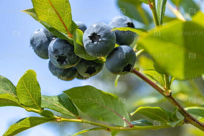 Садовый голубь вкусная, полезная ягода. Vaccinium corymbosum, высокорослый голубь. Голубые спелые ягоды на здоровом зеленом растении. Поле черники, фруктовый сад