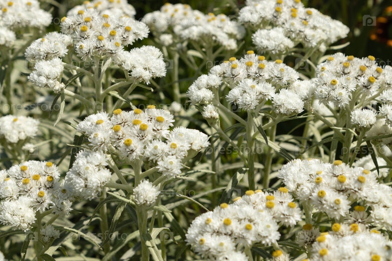 Anaphalis или triplinervis жемчужная вечная, много белых цветов на заднем плане. крупный план