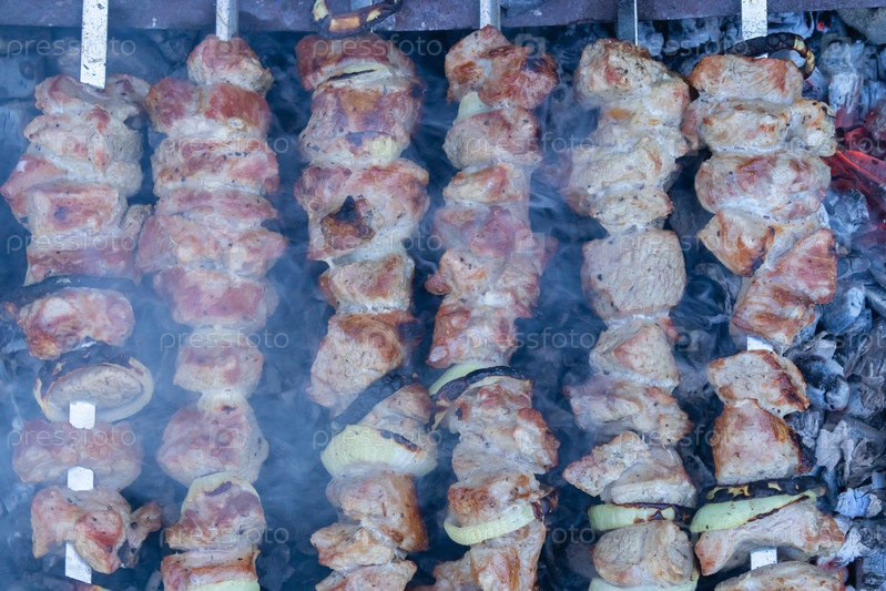 Здоровое мясо барбекю на шампурах над мангалом на открытом воздухе