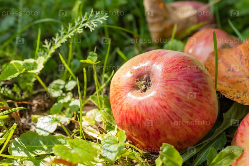 Спелое красное яблоко лежит в траве осеннего сада. крупным планом