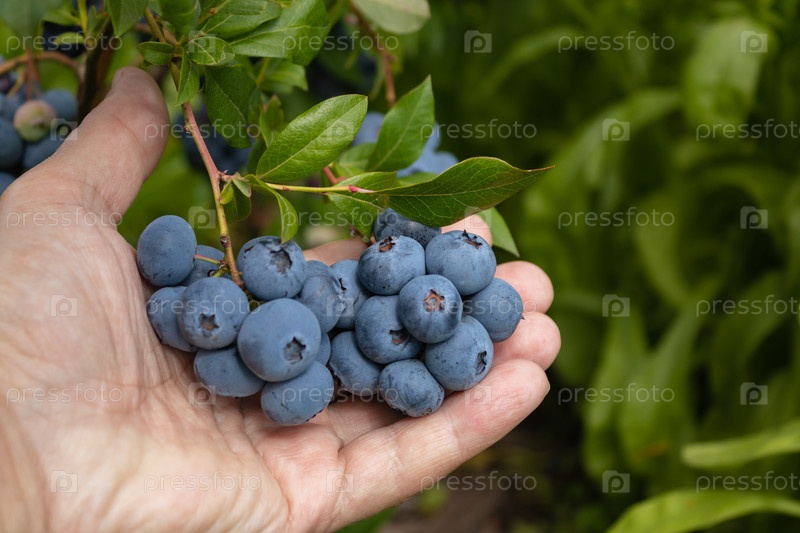 Садовый голубь вкусная, полезная ягода. Vaccinium corymbosum, черника. Мужская рука держит кучу синих спелых ягод. крупный план
