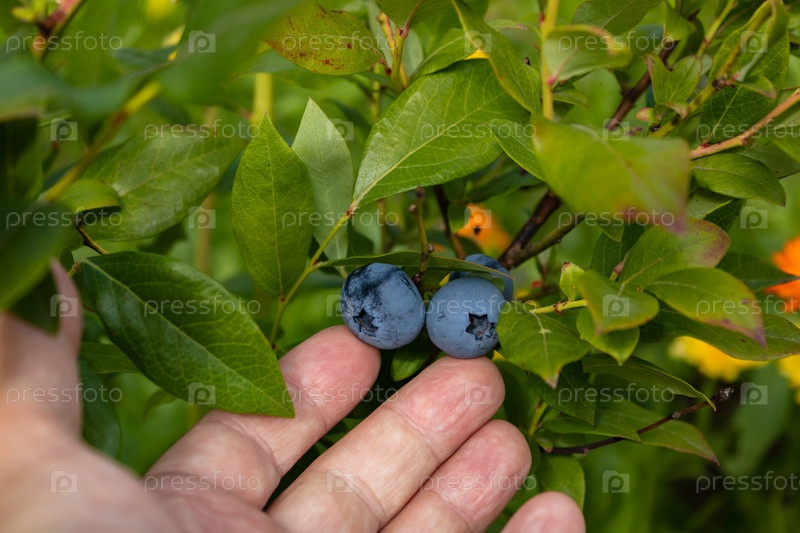 Садовый голубь вкусная, полезная ягода. Vaccinium corymbosum, черника. Мужская рука держит кучу синих спелых ягод. крупный план