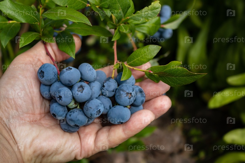 Садовый голубь вкусная, полезная ягода. Vaccinium corymbosum, черника. Мужская рука держит кучу синих спелых ягод. крупный план