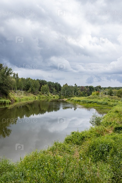 Летний пейзаж на берегу реки, пасмурный день. Калужская область, Россия