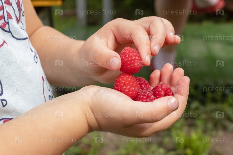 Маленький ребенок держит в ладонях красную малину. Ягоды малины и детские руки крупным планом