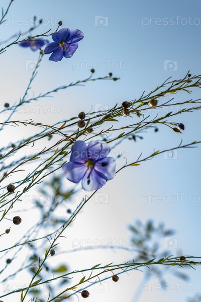 Голубые цветы льна на клумбе, лето, крупный план