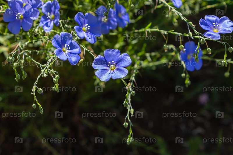 Голубые цветы льна на клумбе, лето, крупный план