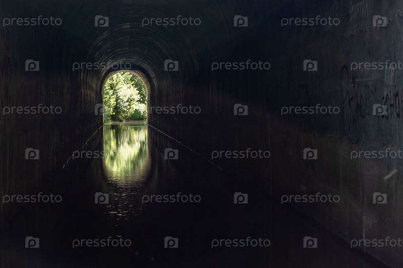 Туннель с проточной водой и выходом вдалеке. есть свет в конце туннеля