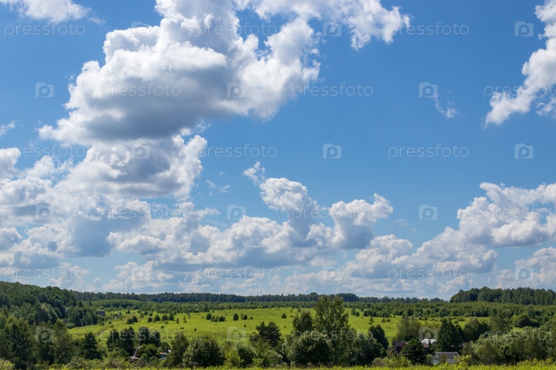 Яркий летний пейзаж с голубым небом. Зеленые поля в сельской местности. Московская область, Россия