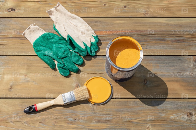 Банка желтой краски с кистью и перчатками, готовая к покраске. концепция ремонта и реконструкции, вид сверху