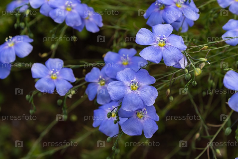 Голубые цветы льна на клумбе, лето, крупный план