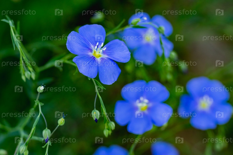 Голубые цветы льна на клумбе, лето, крупный план
