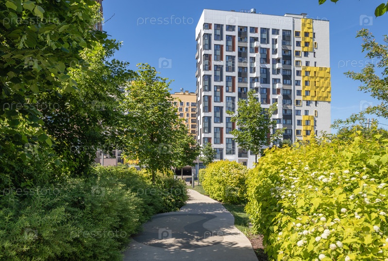 Современный многоквартирный дом с красочными фасадами на окраине города. Жилой комплекс «В лесу», Москва, Россия