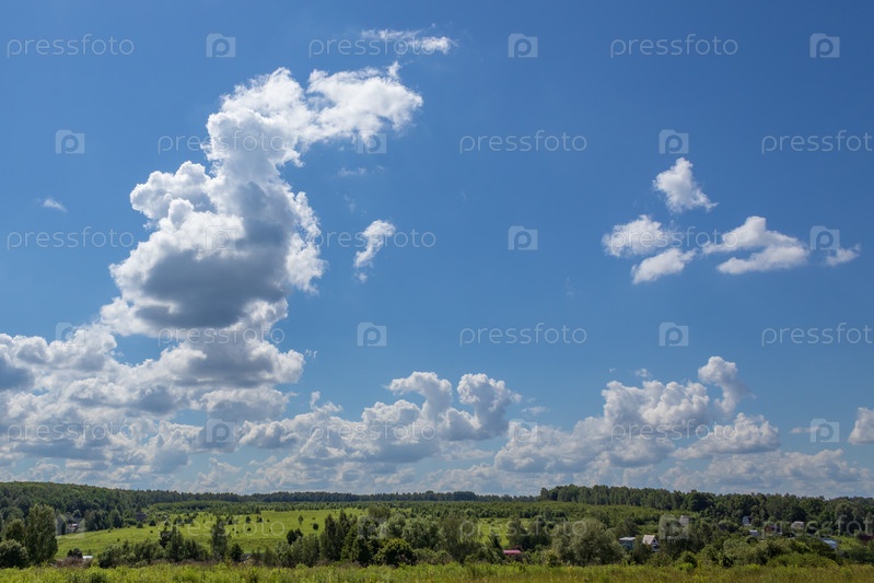 Яркий летний пейзаж с голубым небом. Зеленые поля в сельской местности. Московская область, Россия