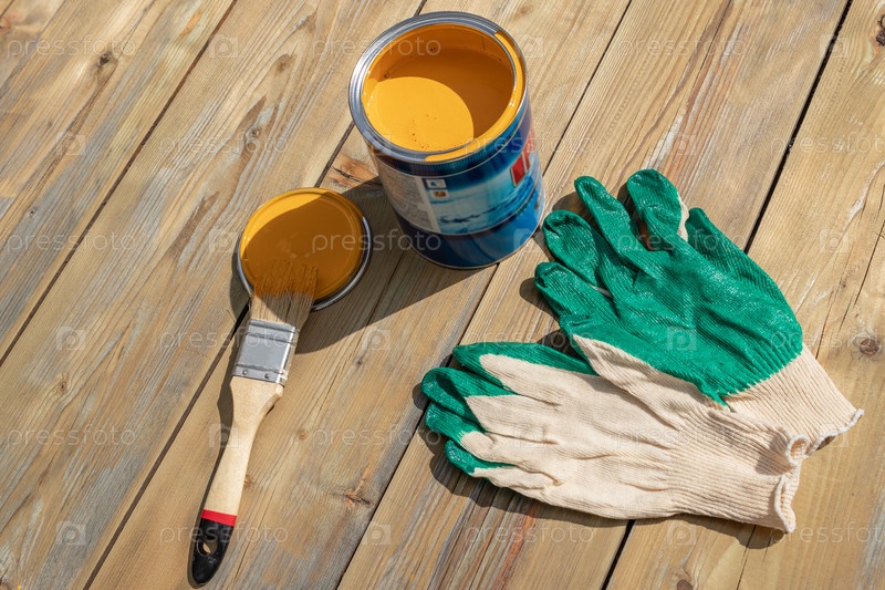 Банка желтой краски с кистью и перчатками, готовая к покраске. концепция ремонта и реконструкции, вид сверху