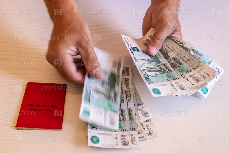Руки пенсионера рассматривает купюры в 1000 рублей, пенсионное удостоверение. Надпись на удостоверении: «пенсионное удостоверение»
