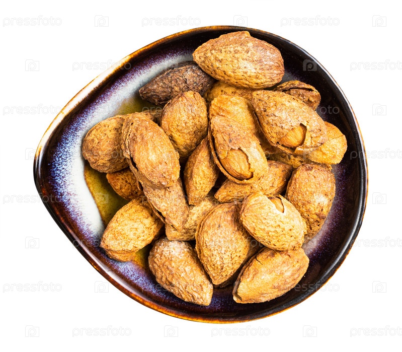 Треснутые миндальные костянки в керамической миске изолированы