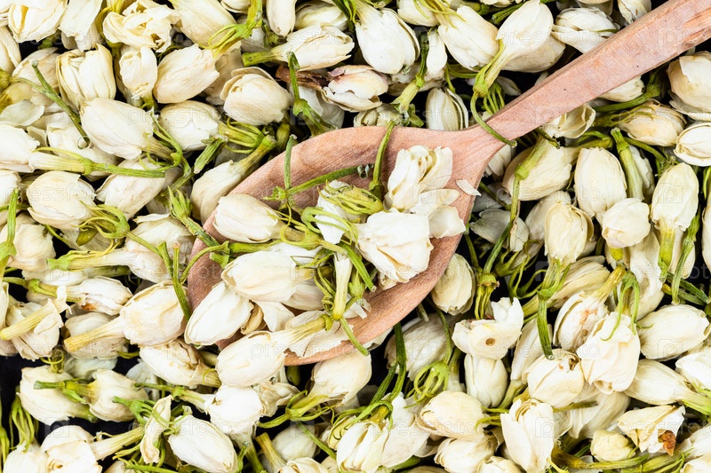Ложка с сушеными цветами жасмина крупным планом на куче