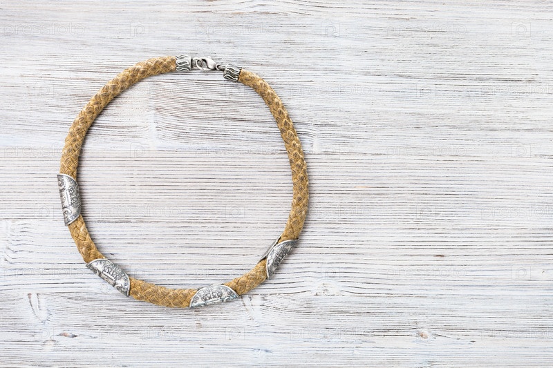 Вид сверху на веревку с ожерельем из монет на сером