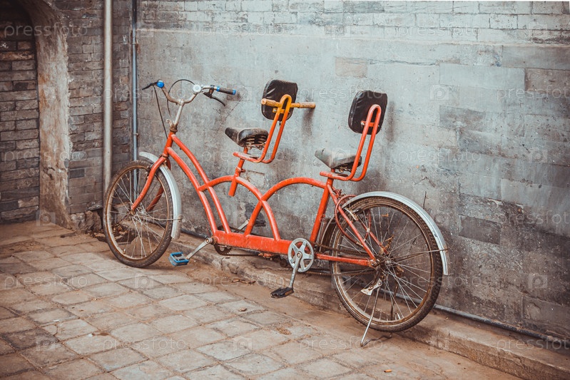 Старый красный ржавый тандемный велосипед возле серой кирпичной стены в Китае