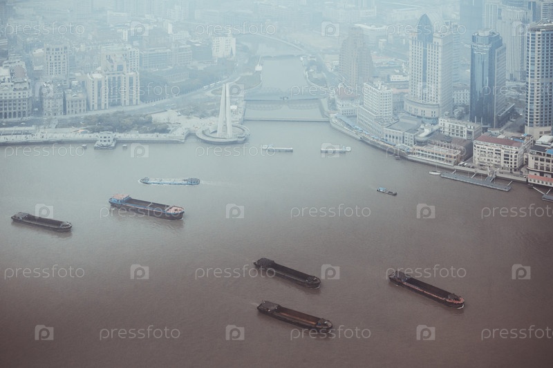 Вид с высокого здания на корабли на желтой реке Хуаньхэ в туманном смоге города Шанхай в Китае Вид с высоты птичьего полета на баржи и корабли на реке Хуанхе в туманном смоге города Шанхай, Китай