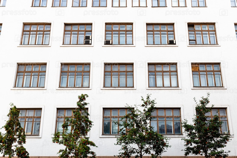 Белый фасад с коричневыми оконными рамами в Москве