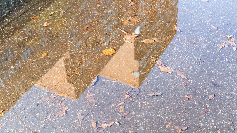 Лужа с опавшими листьями и отражением дома