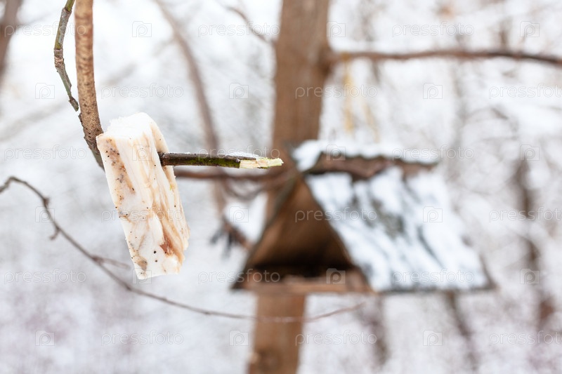 Кусок сала для синиц возле кормушки зимой