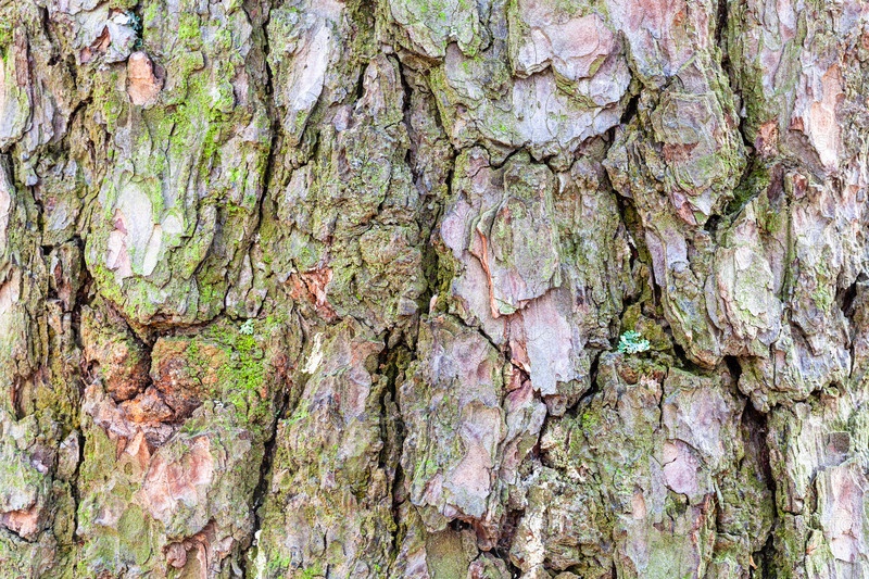 Моховая кора на зрелом стволе сосны крупным планом