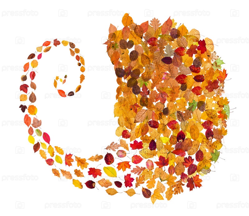 Спиральный поток из опавших листьев, изолированных на белом